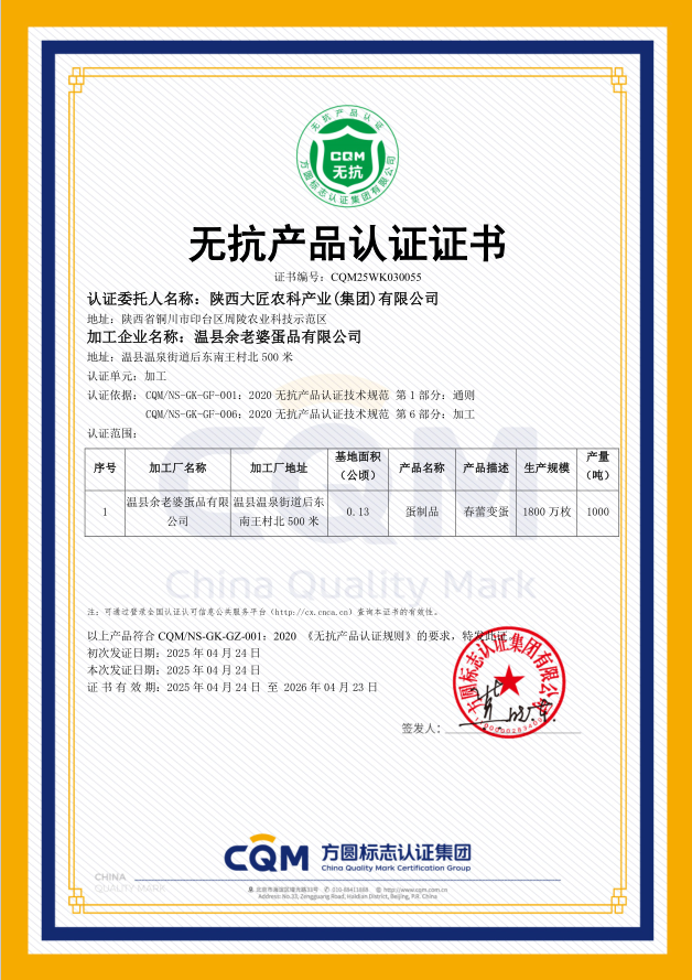 · 04月,春蕾变蛋通过“无抗产品认证”(系鸡蛋变蛋类产品国内首家)。