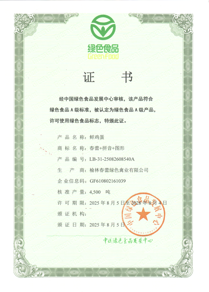 · 08月,春蕾鸡蛋通过中国绿色食品发展中心“绿色食品”续展认证。